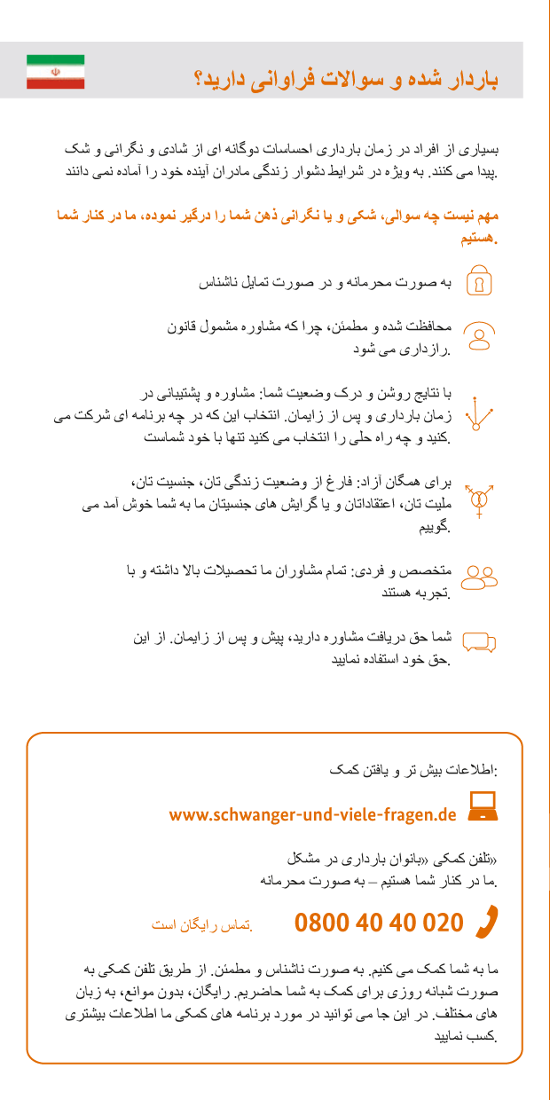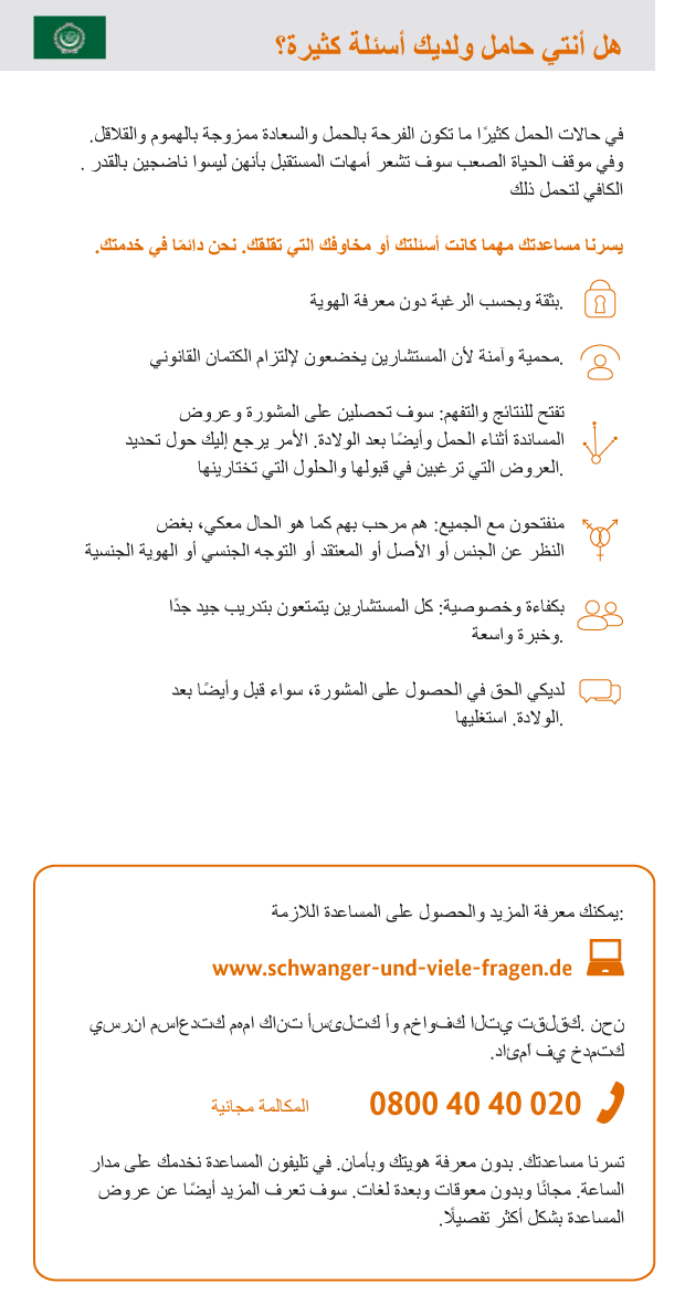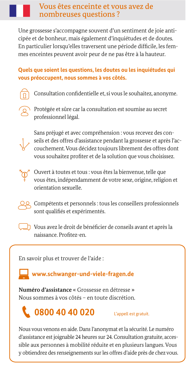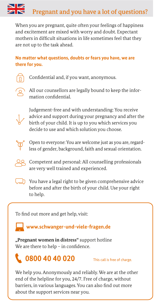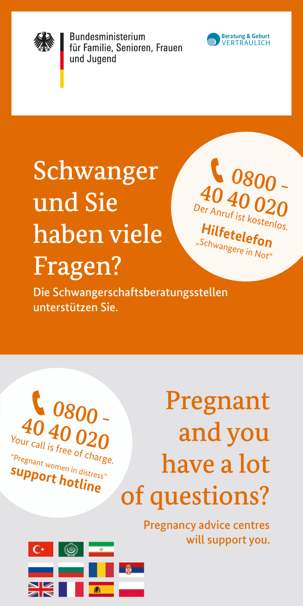 Die wichtigsten Informationen über die Bundesstiftung Mutter und Kind und ihre Hilfen für Schwangere in Notlagen bietet das Info-Faltblatt in verschiedenen Sprachen.